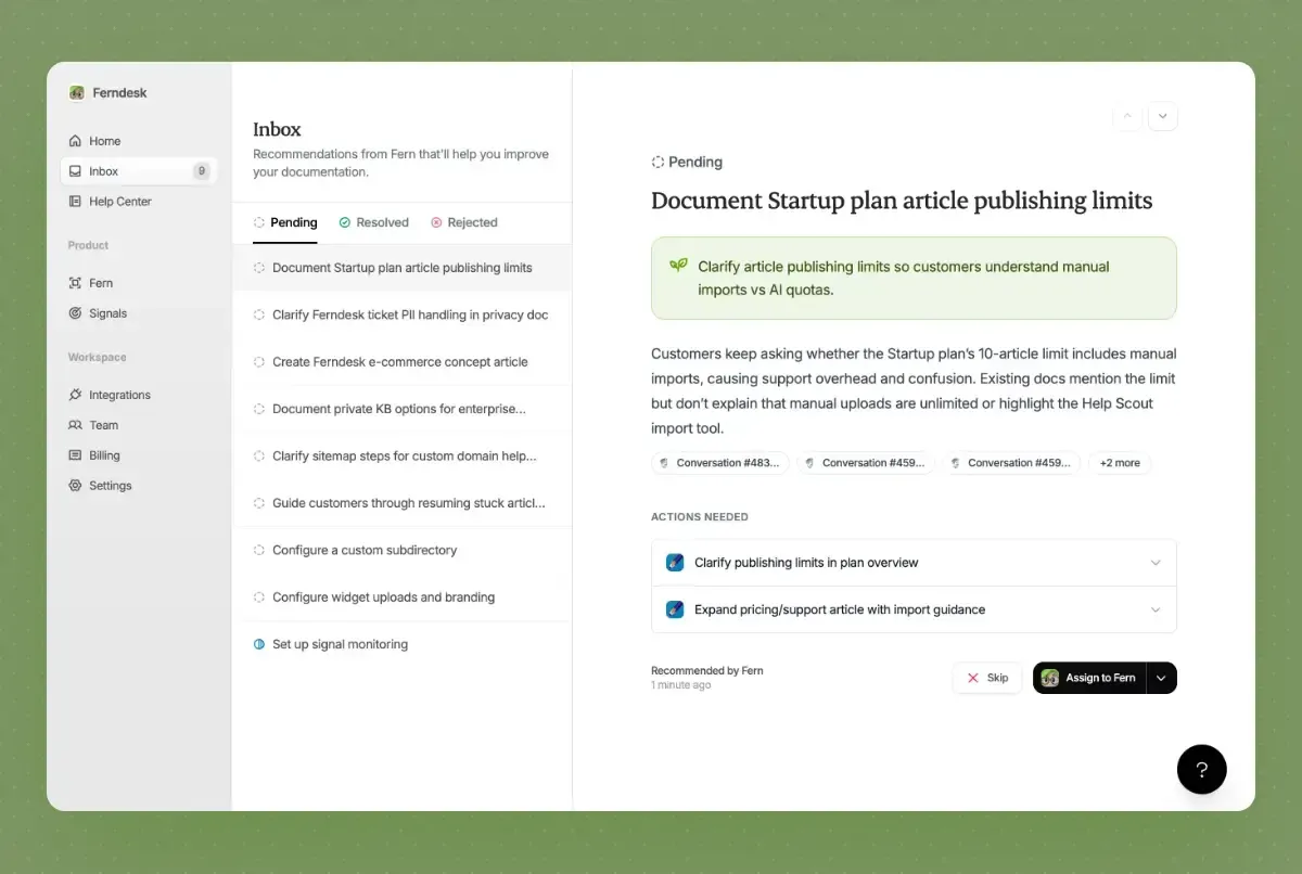 Now you can quickly spot opportunities to improve your help center, and delegate tasks to Fern without jumping between tabs.