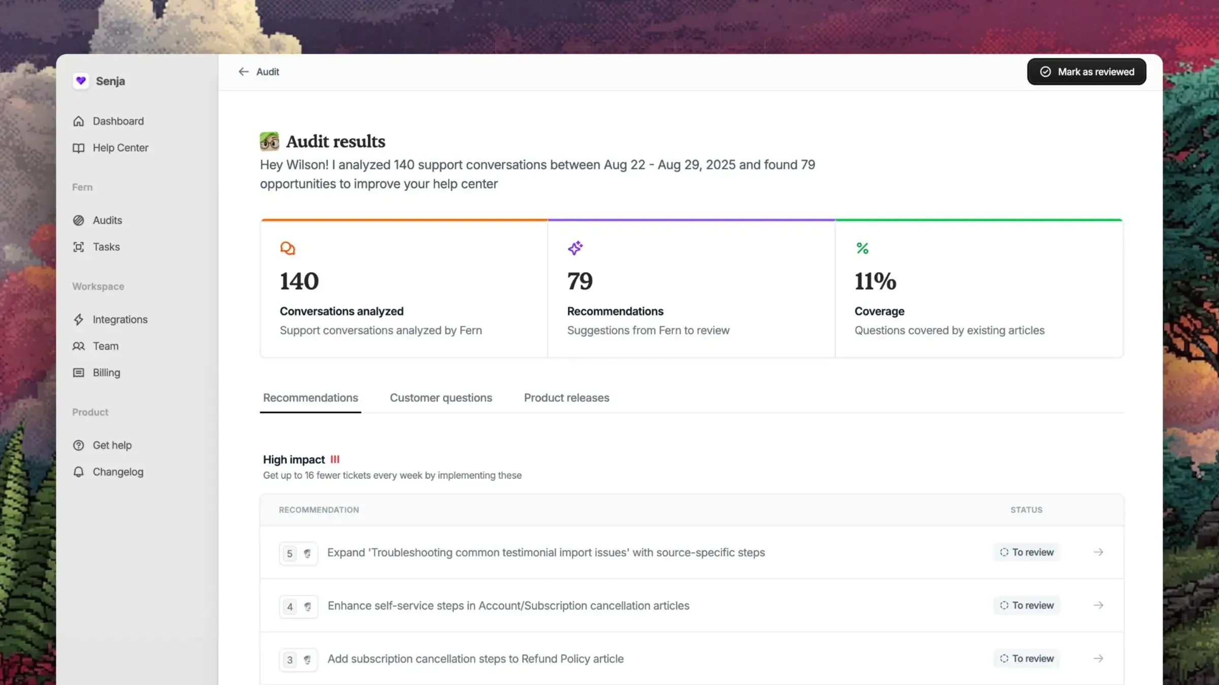 In the near future, Fern will also scan your codebase and Linear to find features and changes that need to be reflected in your help center.